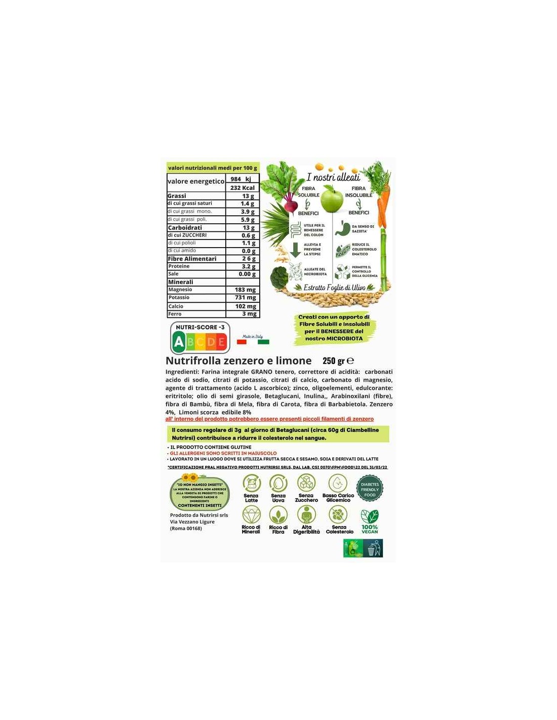 Farina integrale GRANO tenero, correttore di acidità minerali: carbonati acido di sodio, citrati di potassio, citrato di calcio, carbonati di magnesio, Zinco, oligoelementi, edulcorante: eritritolo, olio semi di girasole, grassi vegetali non idrogenati (girasole, cocco, karitè), emulsionante: lecitina di soia; buccia di limone edibile 8%, polpa di zenzero 4%, Betaglugani, Inulina, Arabinoxilani, fibre, carota, barbabietola, bambù.
