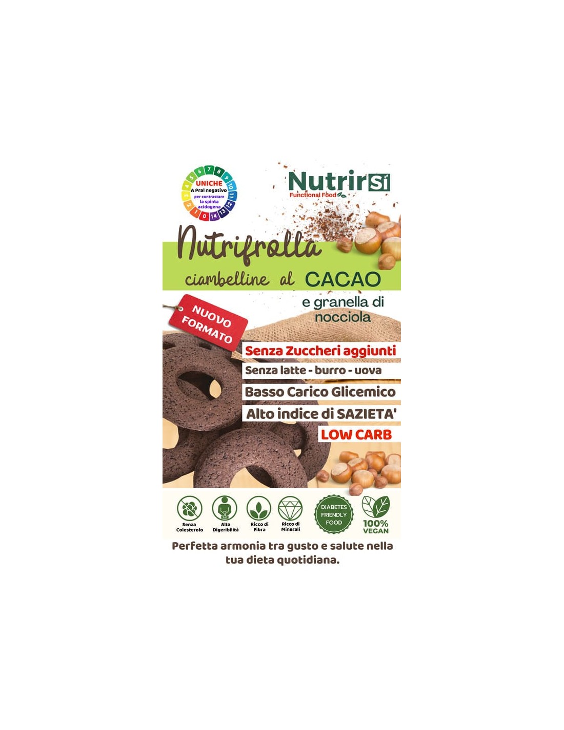 Ciambelline Nutraceutiche con cacao amaro e granella di nocciole. Perfetta armonia tra gusto e salute nella tua dieta quotidiana.