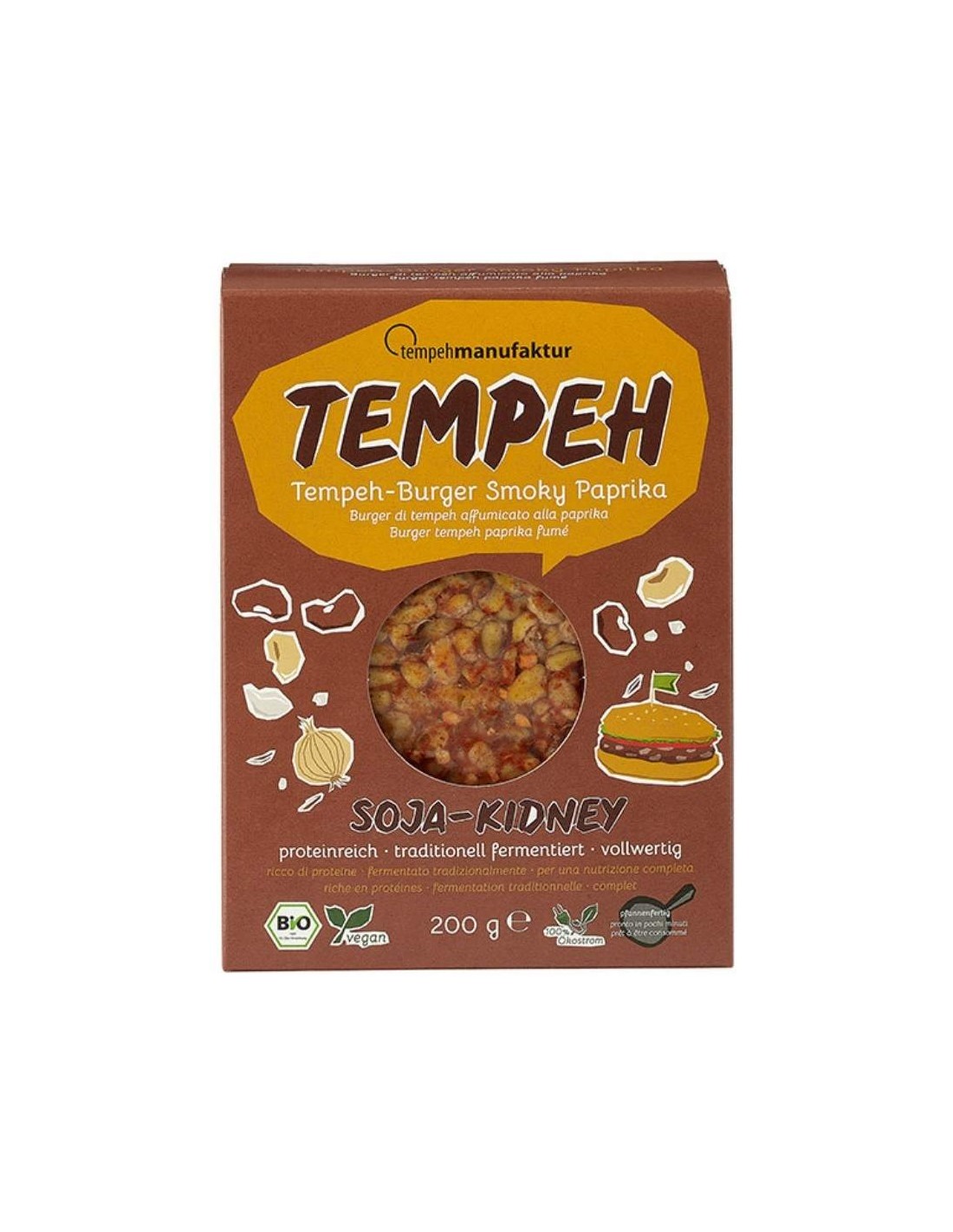 Un burger vegetale a base di tempeh di soia e fagioli rossi, arricchito con paprika affumicata e spezie selezionate. Texture compatta, gusto intenso e una lavorazione tradizionale che valorizza la fermentazione naturale.